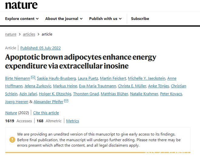 该论文名为:《凋亡的棕色脂肪细胞通过细胞外肌苷增强能量消耗》(Apoptotic brown adipocytes enhance energy expenditure via extracellular inosine)。